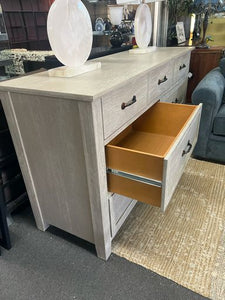 Crafted from solid wood and expertly finished in a warm, weathered tone, the dresser highlights the natural beauty of the wood grain. Each piece features subtle distressing and hand-applied finishes that give it a one-of-a-kind, heirloom feel. The clean lines and framed drawer fronts offer a refined silhouette, while antique-style metal hardware adds a vintage-inspired touch that completes the look.